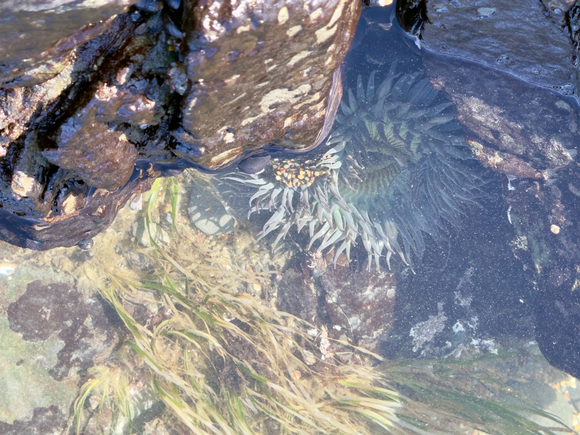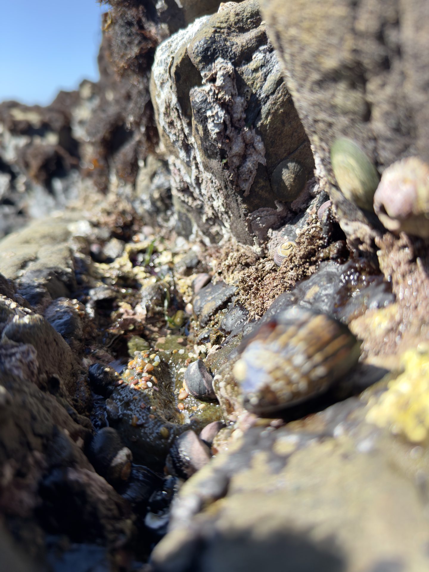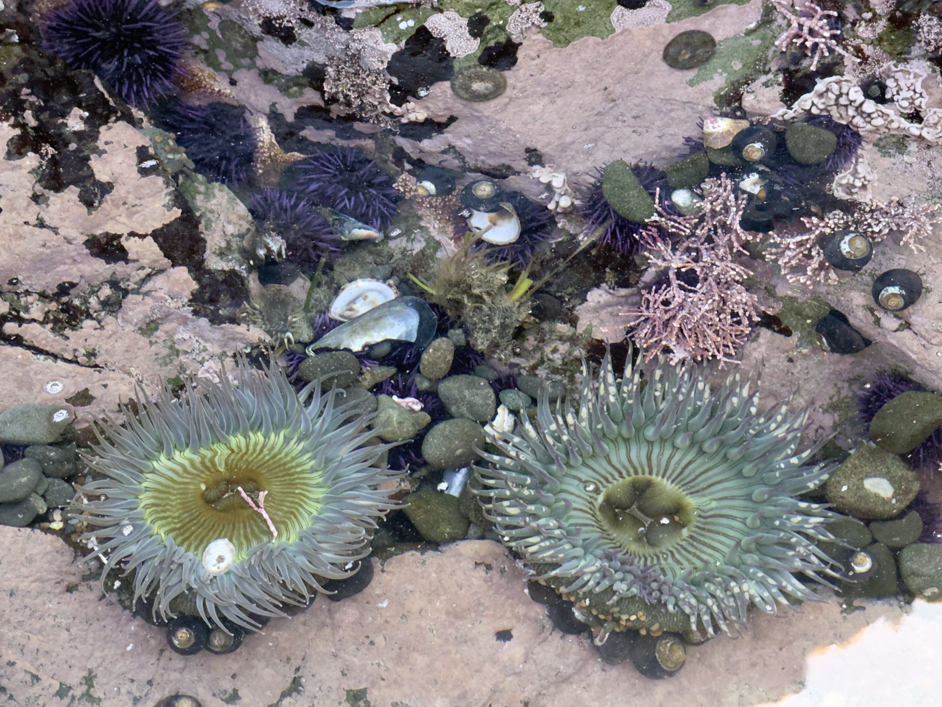 The ocean pulls back. Rocks that normally sit beneath the surface reveal entire miniature ecosystems. Pools form between sandstone shelves. Sea stars cling to shaded crevices. Anemones ripple in the water like underwater flowers.