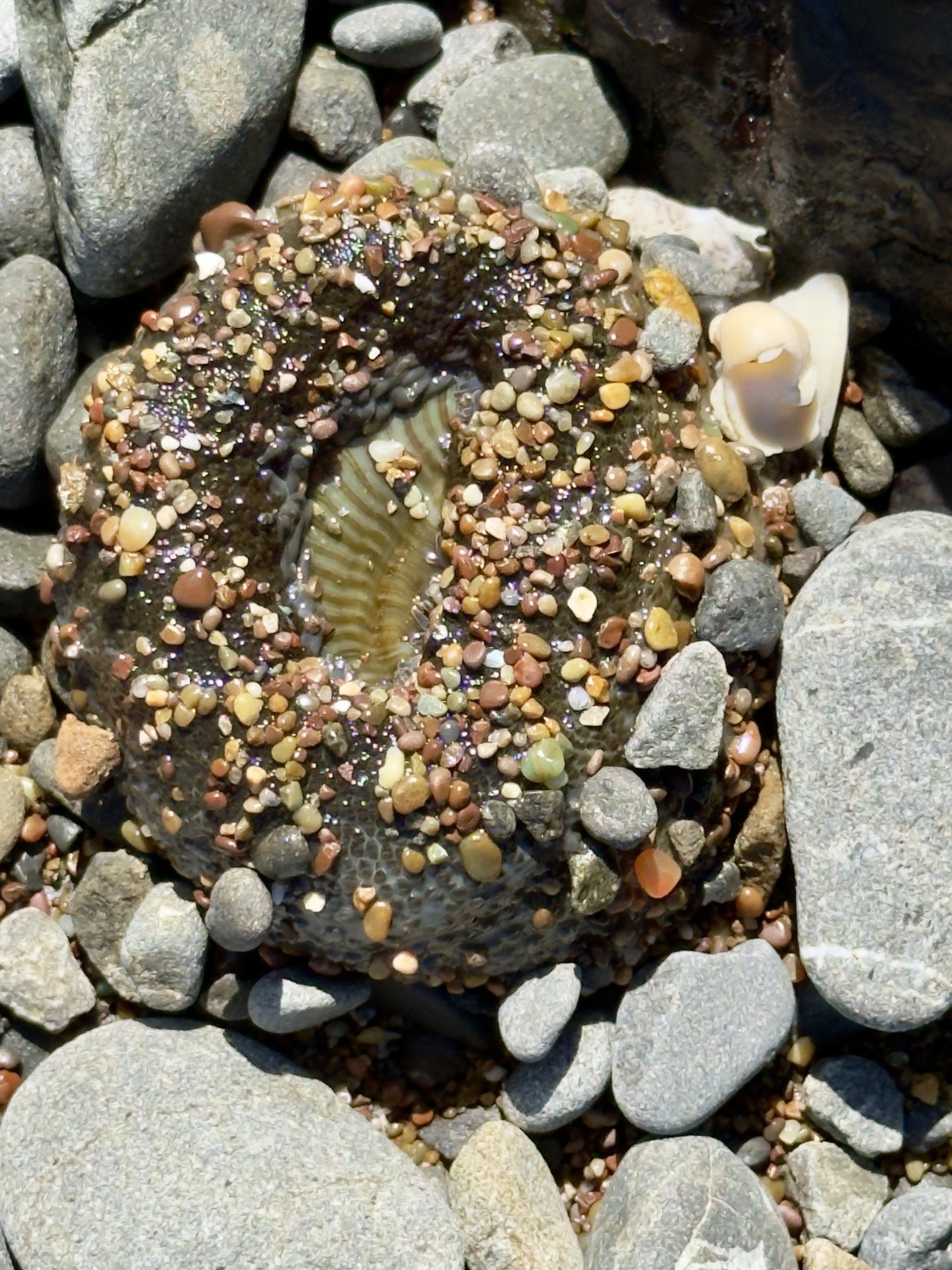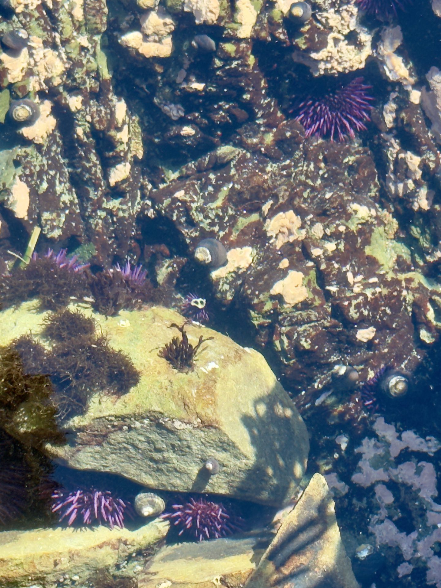 The rocky shoreline here creates deeper pools and more varied marine habitats. When the tide drops far enough, the exposed rock platforms reveal clusters of sea anemones, small crabs, and sometimes bright purple sea urchins.