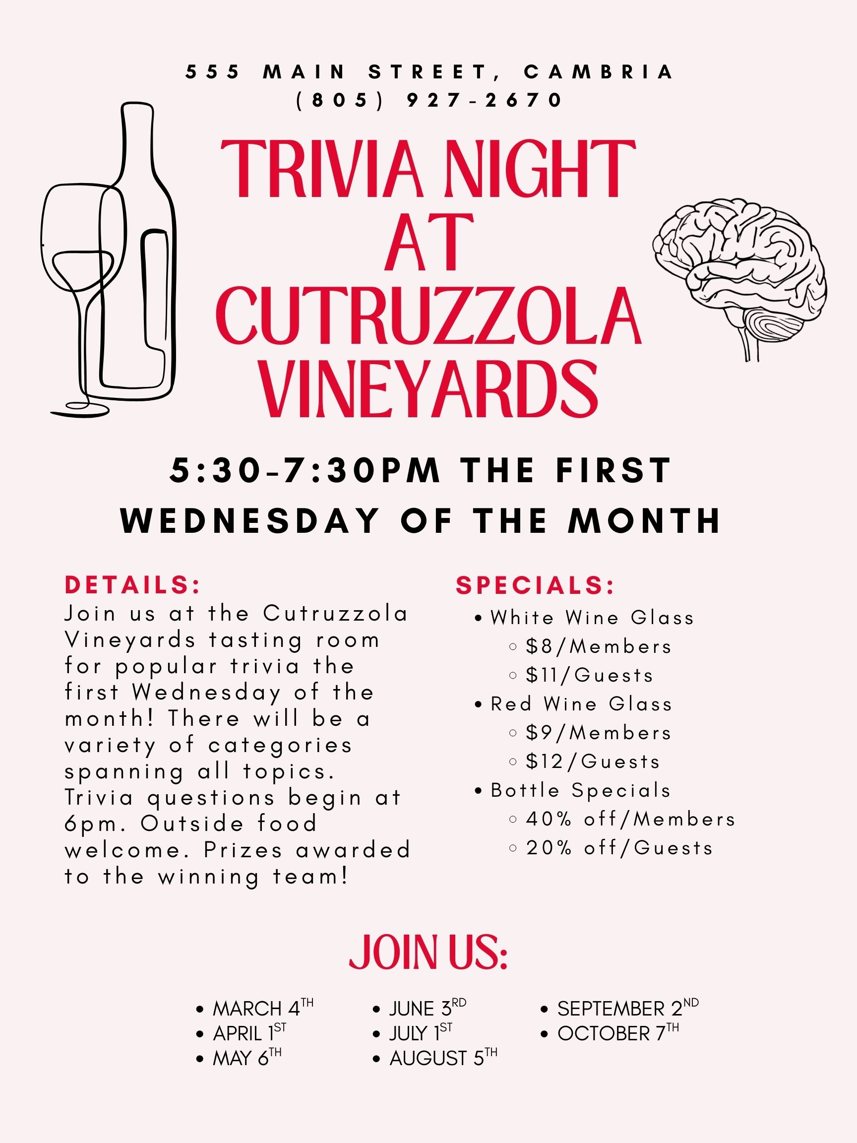 Put your knowledge to the test during Trivia Night at Cutruzzola Vineyards, an evening of friendly competition, wine, and fun in the Cambria tasting room.