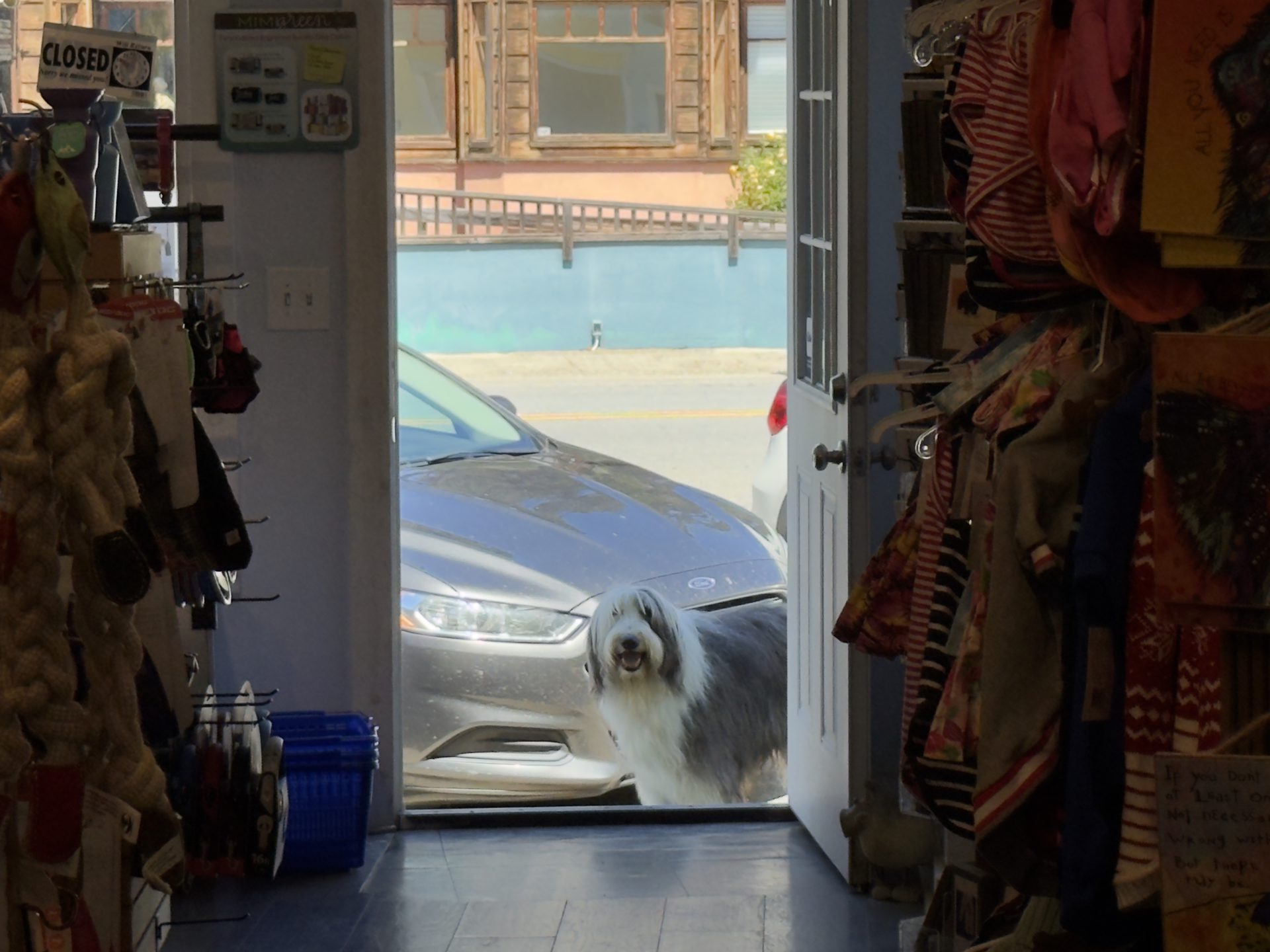 There’s movement behind the counter. A tail wagging. A curious nose peeking up over a display. Maybe a dog stretched out comfortably in a patch of sunlight, completely at home.