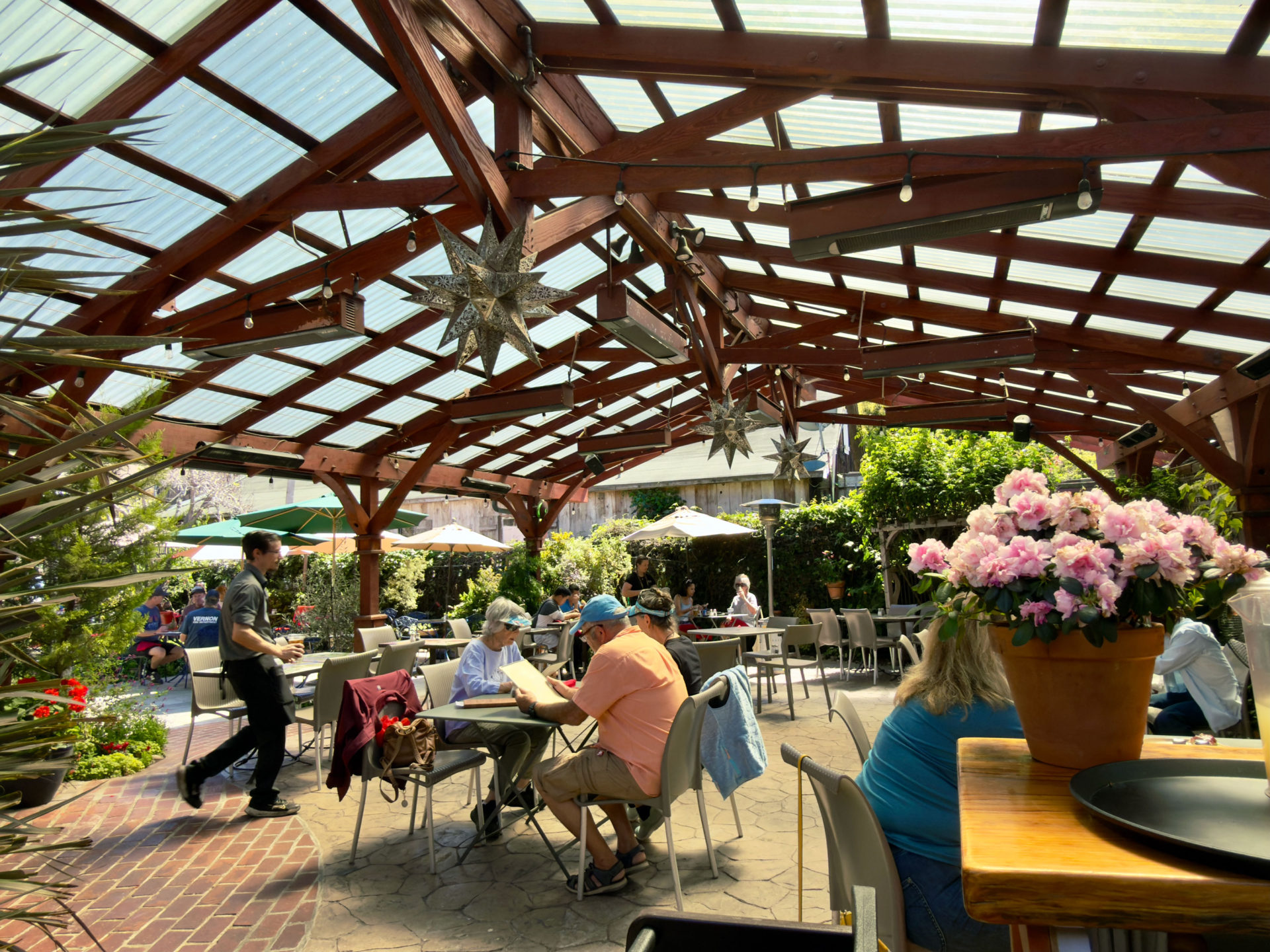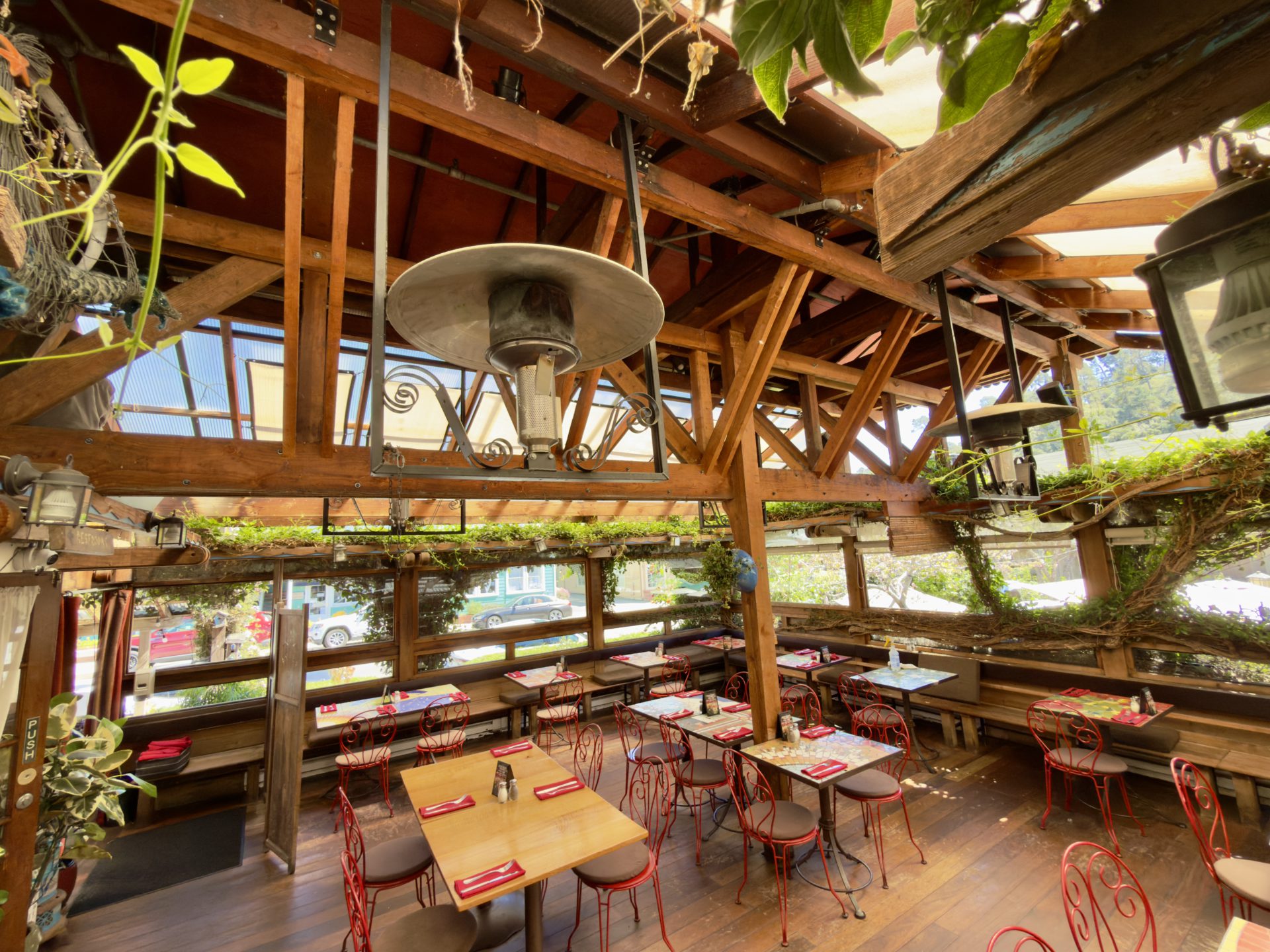 Just inside sits the covered patio, a favorite spot for many regulars. Wooden beams stretch above the tables while climbing vines wrap the structure in green. The space feels open to the garden while still offering a cozy sense of shelter from the cool coastal air.