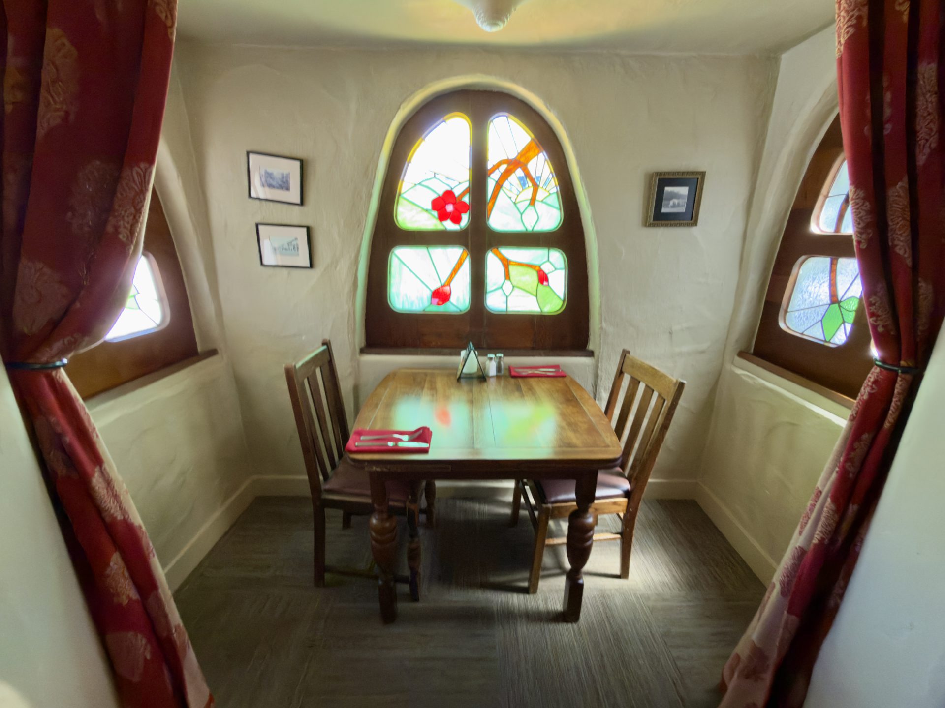 Tucked behind red curtains sits a small alcove framed by a stained glass window. Inside is a single wooden table for two, softly lit and slightly hidden from the rest of the dining room.