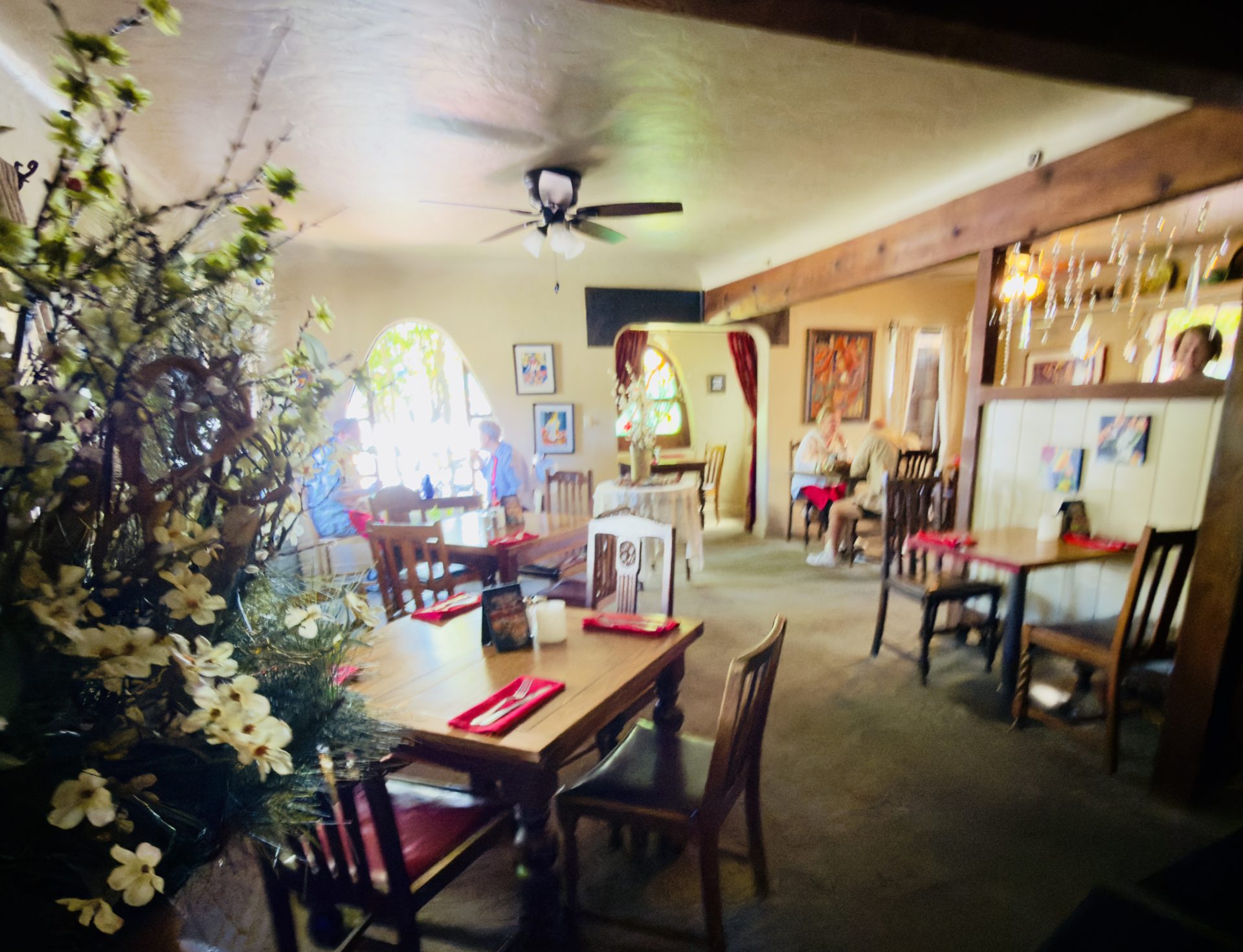Here the dining rooms feel less like a restaurant and more like a welcoming Cambria home. Exposed wooden beams cross the ceilings, colorful artwork lines the walls, and small rooms create quiet corners for conversation.